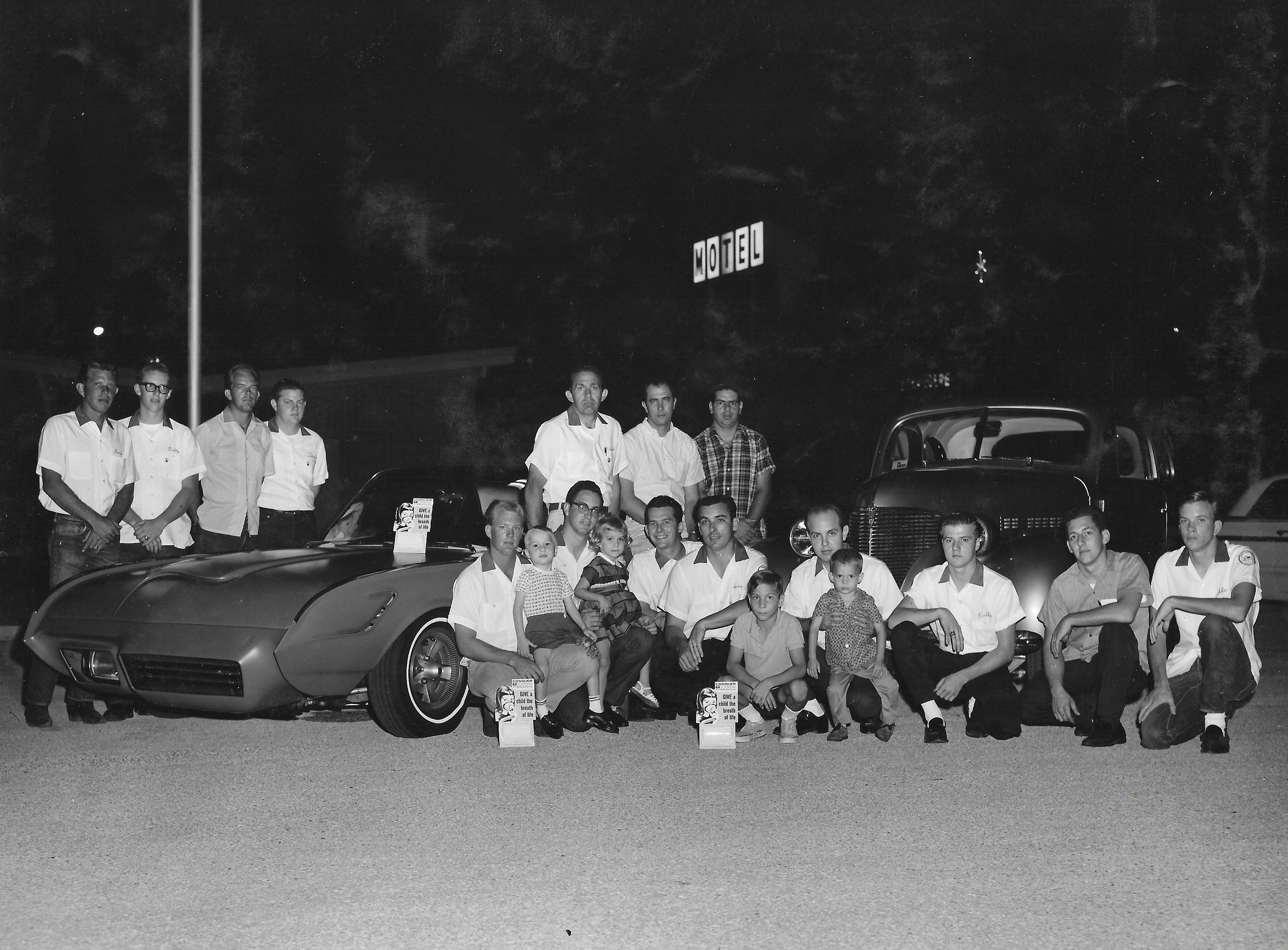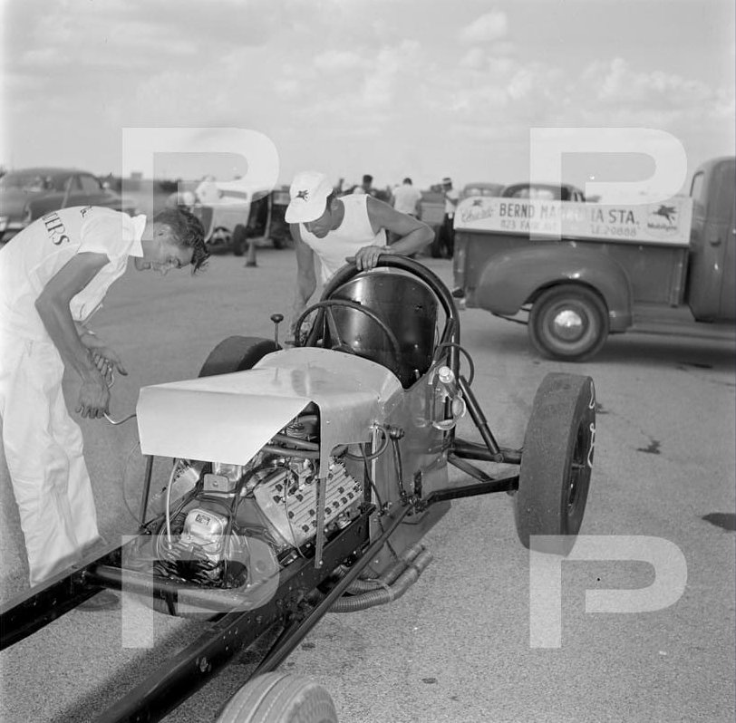 The following magazine article is about Stanley Wilson during the 1950's. The article is incomplete but still interesting. Click the photo to open in a new window to read the article. The next photo was featured in a magazine. I re-typed the print as the scan I had wouldn't be legible. Click the photo to enlarge in a new window. This mid-'60s photo of the Gear Grinders car club was taken in the parking lot of the Wonderland shopping center in San Antonio. Stanley wasn't with the club that day. Kneeling to the right of the front wheel of the asymmetrical custom Thunderbird is Kit Carlisle. At the far right of the photo is Eddie Baumann. Bill Mano, seen standing with the plaid shirt, worked at a local Chevy dealer and equipped his 39 Chevy (pictured) with a smallblock and a four-speed. Directly in front of the Chevy's grille with the young boy on his knee is Will Hodges, and to his right is Sonny Bippert, one of Eddie Baumann's Top Fuel crew members. The Gear Grinders also joined a handful of other area clubs to form the Alamo Timing Association, which organized occasional races at an abandoned airstrip called Martindale Field.